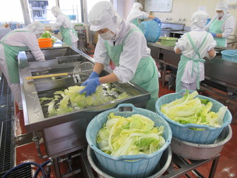 納品されたら、水でよく洗い、消毒液へとつけます。消毒液をよく洗い流し、食べやすい大きさに切り、バットへと配缶していきます。
