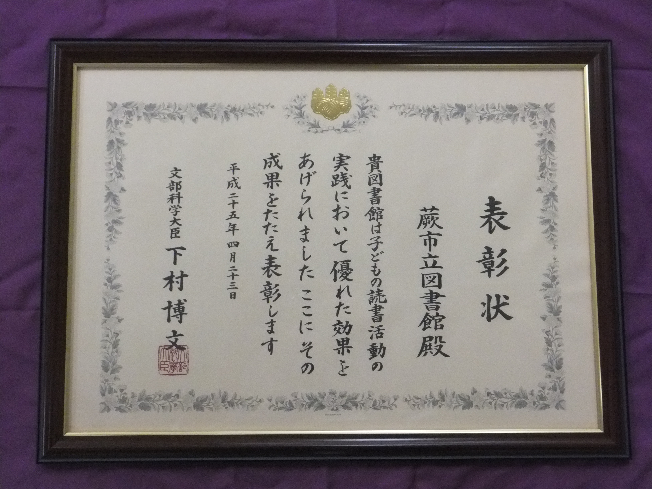 今回は蕨市立図書館における子どもの読書活動推進の活動が評価され、その実践をたたえて文部科学大臣からおくられました。