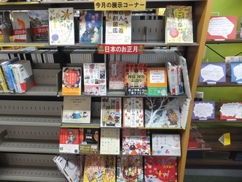 1F展示図書コーナーではお正月にまつわる本を特集しています。