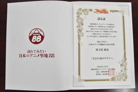 蕨市が舞台となっている女子サッカーアニメ「さよなら私のクラマー」の聖地として、「訪れてみたい日本のアニメ聖地88(2022年版)」に蕨市が選定され、主催の一般社団法人アニメツーリズム協会から「アニメ聖地認定プレート」と「公式ご朱印」が贈呈されました。
