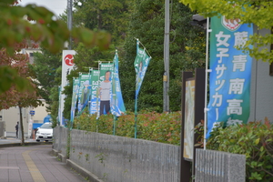 「さよなら私のクラマー」のキャラクターのぼりが市内に立っています