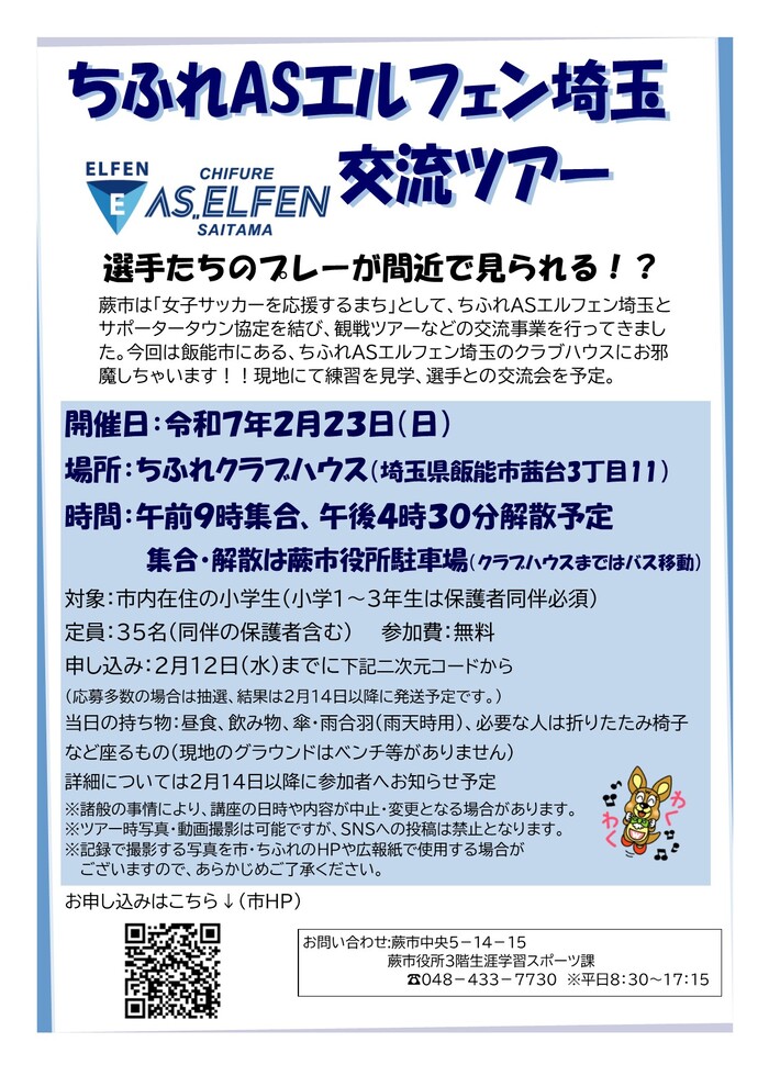 蕨市は「女子サッカーを応援するまち」として、ちふれASエルフェン埼玉とサポータータウン協定を結び、観戦ツアーなどの交流事業を行ってきました。今回は飯能市にある、ちふれASエルフェン埼玉のクラブハウスにて練習などを見学し選手たちとの交流を行います。